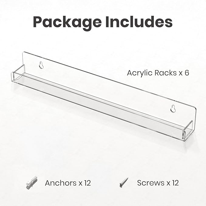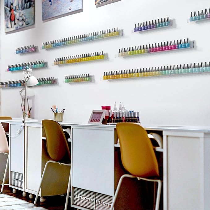 - SET OF 6 TIER - It comes with 6 pieces of acrylic nail polish racks, each wall floating shelf is individual, can be mounted separately or as a combo of 2 or 3 racks with the included screws and anchors. It measures 24" x 1.6" (Length x Deep), holds about 20-25 bottles.