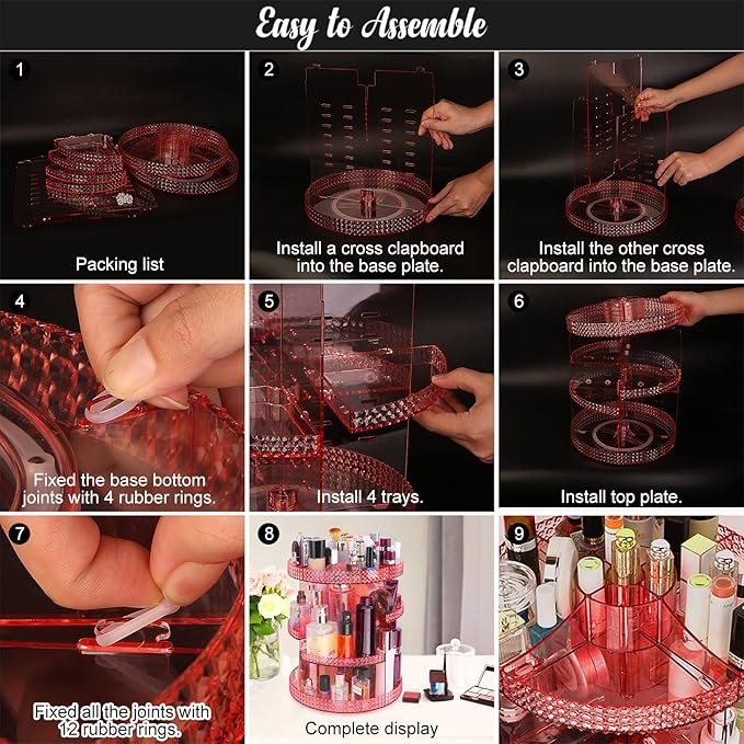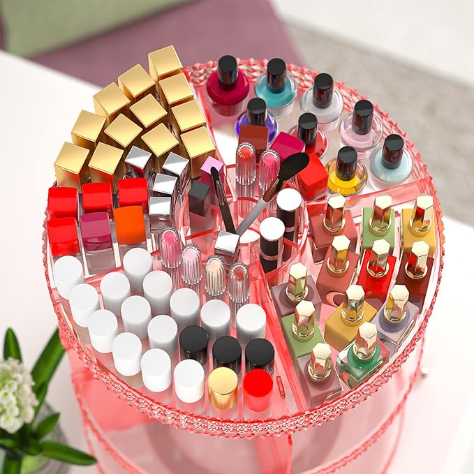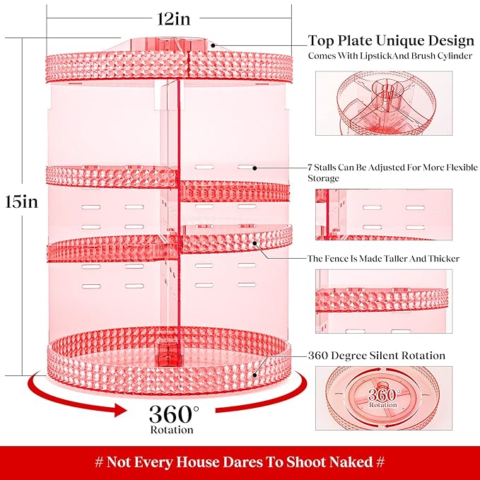 Pink 360 Makeup Organizer Carousel, Makeup Organizer for Vanity, Acrylic Make Up Organizer, Large 7 Layers 360 Makeup Organizer, Fits Makeup Brushes, Lipsticks, Bathroom, Vanity, Plus Size Pink