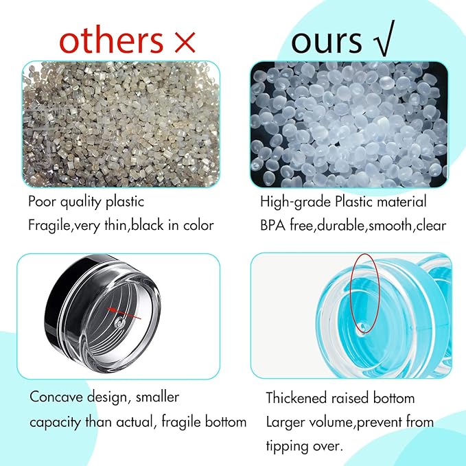 - [PREMIUM QUALITY DESIGN] These 5 gram cosmetic containers are made of high-grade polypropylene, generally do not react chemically with makeup, are resistant to breaking and warping from heat, have a tight seal, and prevent leaking. And with PS (polystyrene ) bottle body & PP (polypropylene) lid, these sample jars are thick and smooth.