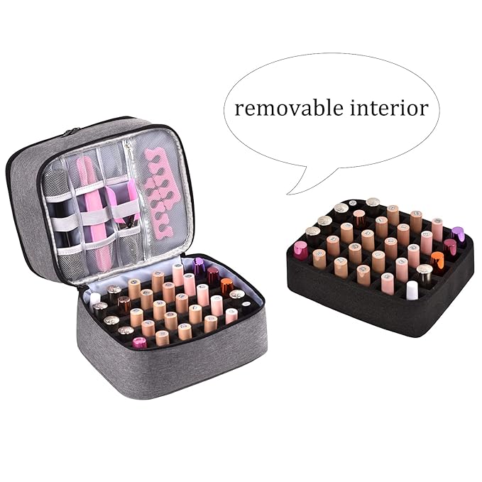 - Double compartments nail polish and manicure set tools storage organizer. Made of heavy duty materials for long lasting performance. Well padded outer shell provides superb protection to nail polish bottles. This sturdy nail polish organizer container is ideal for both professionals and nail hobbyist