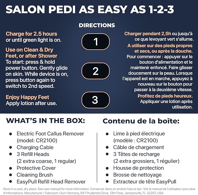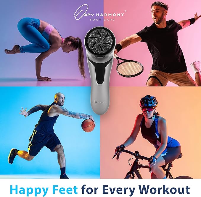 - Happy Feet Tips: Charge for 2.5 hours; Use on clean and dry feet, or after shower; Gently glide roller on heels, toes and soles of feet – do not apply pressure; Use extra coarse roller for heavy callus build-up; Use regular coarse roller to maintain smooth & soft feet