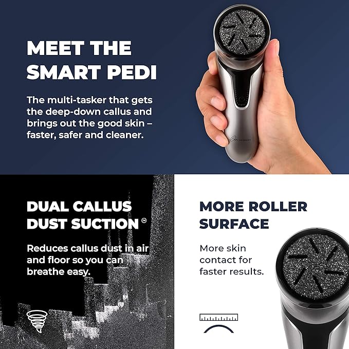 - Fast 2.5hr Charge, Upgraded 2200 rpm and 2 Speeds - Enjoy instantly smooth feet; Next-gen 1300mAh rechargeable battery to buff away hard, dry, dead skin; Reveal baby-soft skin in minutes with no prep time; Easier and faster than callus remover gel, pumice stone, foot file or pedicure rasp tools