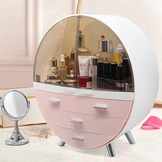 - LARGE CAPACITY: Drawer type large capacity: 4 classified storage drawers, dustproof and moisture-proof,Double open magnetic door: It can be rotated smooth and easily taken,Top Versatile Cosmetic Box: The transparent window has convenient lifting and closing on both sides.