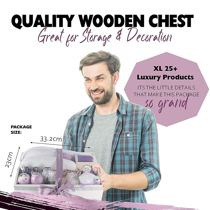- XL Ultimate Pampering Hamper: HE luxuriously crafted wooden gift box includes the full at home spa experience accessories - Starting with Body Lotion, & Bubble Bath. It also includes Shower Gel, Shampoo, Body Cream, Full Body Scrub, Bath Oil, Bath Crystals, Bath Fizzers, Bath Soap, Exfoliating Face Mask, Moisturizing Lip Balm, Bath Sponge, Shower Gloves, Lavender Silk Eye Mask, Loofah Back Scrubber, Face Towel, Bath Mesh Bag with Dried Flowers. Topped off with the plushest bath pillow.