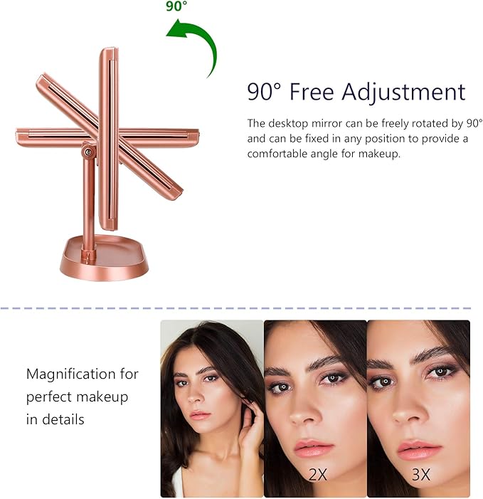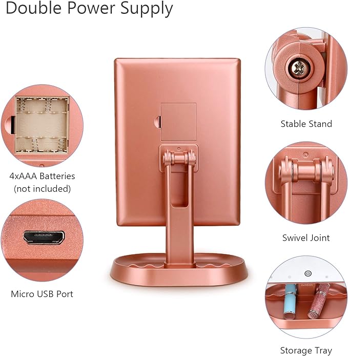 - 【 90° ROTATION & DOUBLE POWER SUPPLY 】 - The professional tabletop mirror can be rotated 90°, can be fixed in any position to give comfortable viewing angle. The mirror operated by Micro USB cable supply or 4 AAA batteries, whether you are at home or outdoor, it is very practical.( battery not included, usb wire included, pls noted the mirror can't store power by itself).