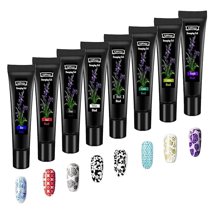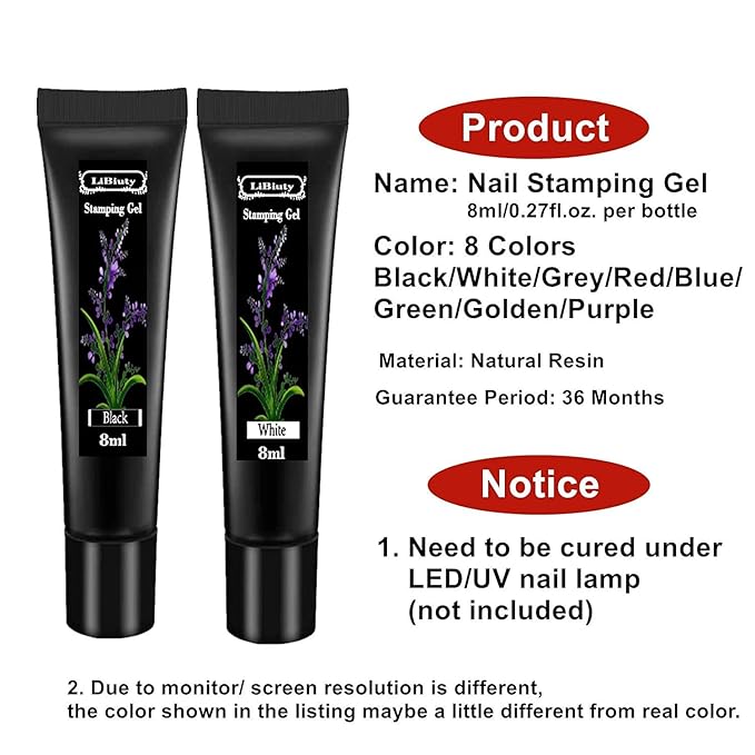 - ★3. Nail Stamping Gel Set : 8 Colors (Black/ White/ Grey/ Red/ Green/ Blue/ Golden/ Purple), each color is 8ml, bring you different nail DIY experience .