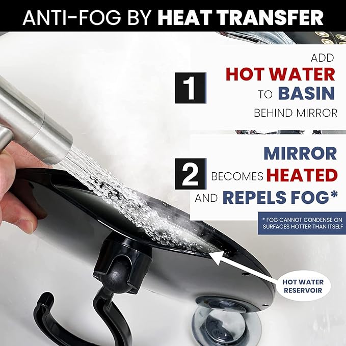 - INNOVATIVE WATER RESERVOIR DESIGN: Keeps fog away by heating the mirror’s glass surface with hot water; perfect for uninterrupted grooming and shaving
