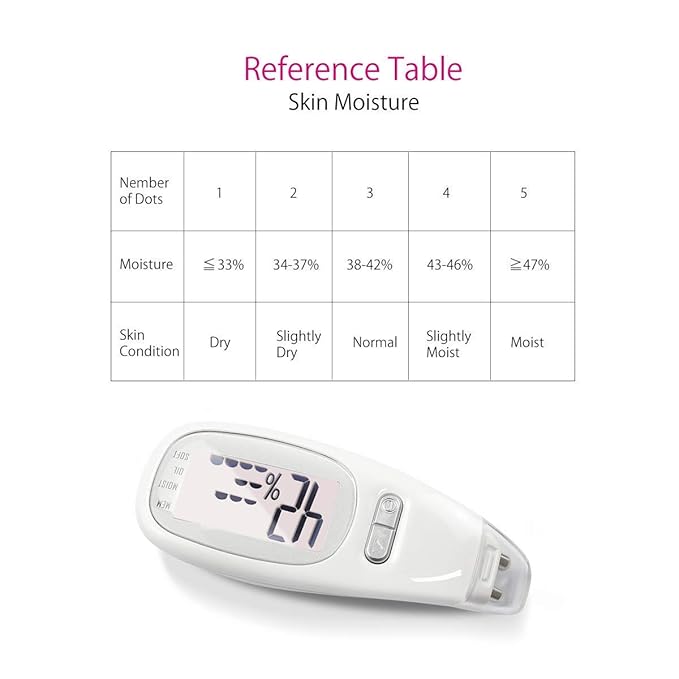 - FEATURES :Large LCD.Backlight function.Test skin moisture, oil and softness.Store the latest 5 sets of data.Low battery indicator.Auto shut off.