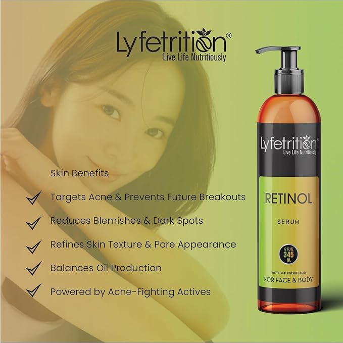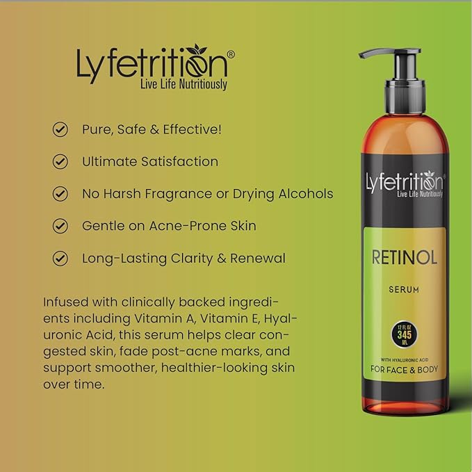 Retinol Acne Serum by Lyfetrition, Infused with Hyaluronic Acid and Vitamin C, Pomegranate & Green Tea,Face toner, Reduce Wrinkles, Pores and Fine Lines, Moisturize & Supple Skin, (12 FL oz)