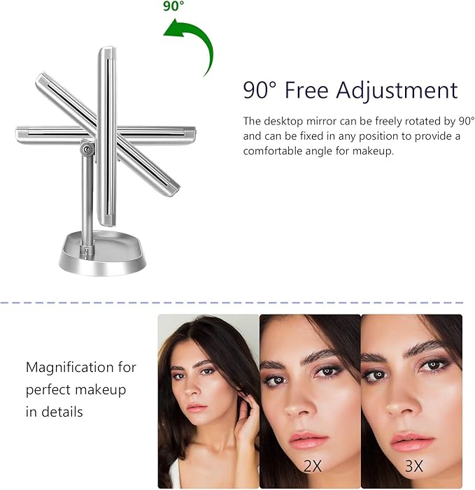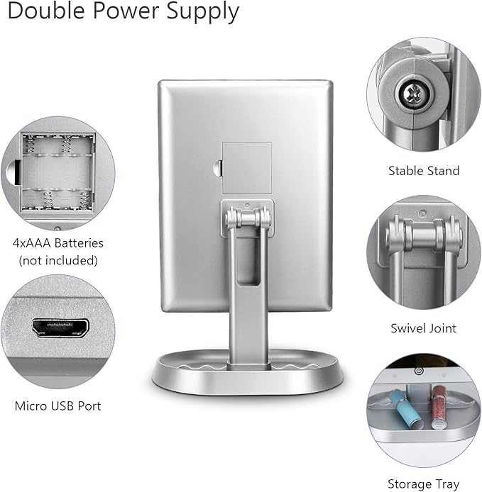 - 【 90° ROTATION & DOUBLE POWER SUPPLY 】 - The professional tabletop mirror can be rotated 90°, can be fixed in any position to give comfortable viewing angle. The mirror operated by Micro USB cable supply or 4 AAA batteries, whether you are at home or outdoor, it is very practical.( battery not included, usb wire included, pls noted the mirror can't store power by itself).