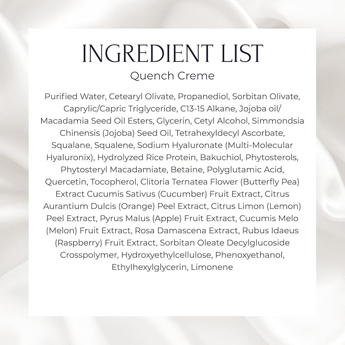 - Quench Your Skin’s Thirst with Deep Hydration — With magic derived from nature, Quench Crème hydrates your skin with hyaluronic acid, polyglutamic acid, and a botanical lipid blend to instantly make skin appear smoother with greater elasticity.
