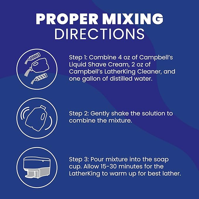 - LATHERKING USE DIRECTIONS: Combine the Campbell’s Liquid Shave Cream, Campbell’s LatherKing Cleaner, and 1 gallon of distilled water. Gently shake the solution to combine the mixture. Pour the mixture into the soap cup and allow the lather to heat up for 15–30 minutes for the perfect, hot lather.
