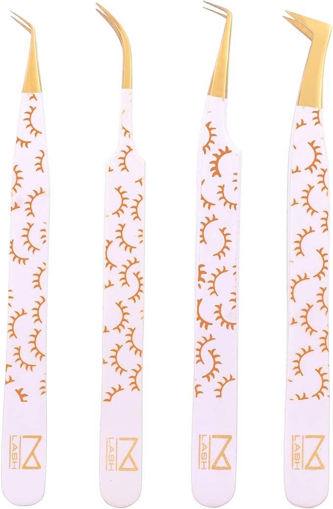 M LASH Tweezers for Eyelash Extensions (Set of 4) - Professional Lash Extension Tweezers - Fiber Tip, Japanese Steel, Diamond Grip Eyelash Extension Tweezer (H-SET)