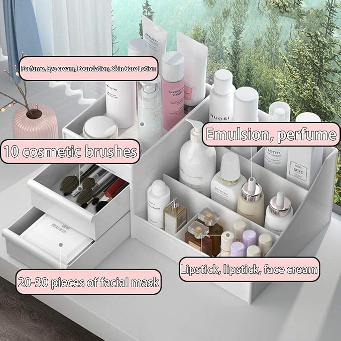 skin care organizer,Makeup Desk Organizer With Drawers,Countertop Organizer for Cosmetics,Vanity brush with Holder for Lipstick, Brushes, Eyeshadow, and Jewelry Desktop Finishing Dresser (White)