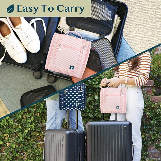 PAVILIA Toiletry Bag Travel Bag for Women Men, Hanging Cosmetic Organizer, Water Resistant Makeup Bag for Accessories Toiletries, Large Travel Essentials Kit (Pink Stripe)