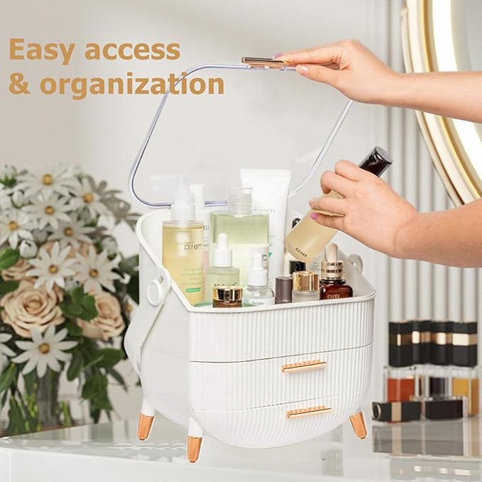 - Large Capacity: The makeup organizer has dustproof clear lid and 2 drawers. The top large tier is perfect for storing small lotion bottles, tall skincare bottles, and makeup brush holders. The 2 divided draws can hold accessories like lipsticks, eyeliners, eyebrow pencils, eye shadows, nail polishes etc.