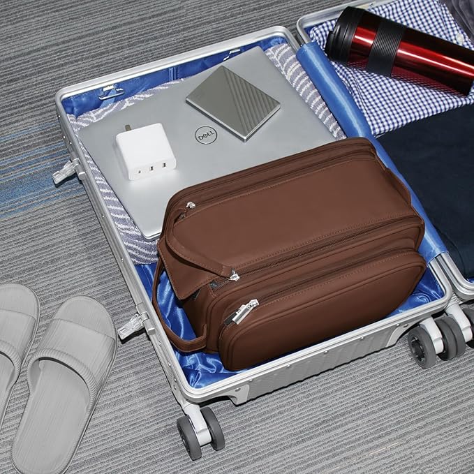 - HANDY DESIGN FEATURES: Crafted with your comfort and ease in consideration, this travel toiletry bag equipped with a leather handle, making it easy to carry and grab. Inside, elastic straps keep bottles upright and secure, preventing spills. The double zipper compartment allows quick access, even without fully opening the bag.it's an ideal companion for both business trips and vacations, effortlessly merging functionality with style, suitable for both men and women