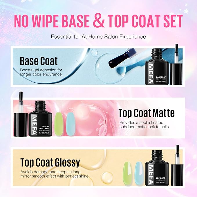- Trendy Color Selection: MEFA's 32-color gel polish set offers vibrant shades for all seasons. Includes 32 colors, base coat, glossy and matte top coats (7 ml each). Embrace fashion with MEFA's 35-piece collection, matching every mood and style