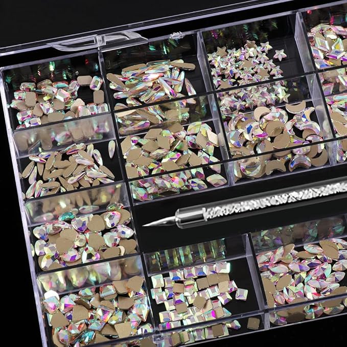 3100Pcs Nail Crystal Rhinestones Kit, Mix Shapes AB Glass, 3D Diamonds Flatback Crystals, with a Drill Pen, Nail Crystal Non Hotfix, Nail Art Decoration(Silver)