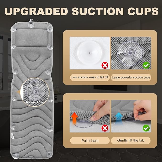 - Perfect for Any Bath Tub: Our full body bath pillow is universal and easy to fix, as it fits any tub - soaking, straight back, freestanding, and more. Indulge in a relaxing spa experience and feel the difference with our bathtub cushion. An ideal choice for anyone who loves bathing
