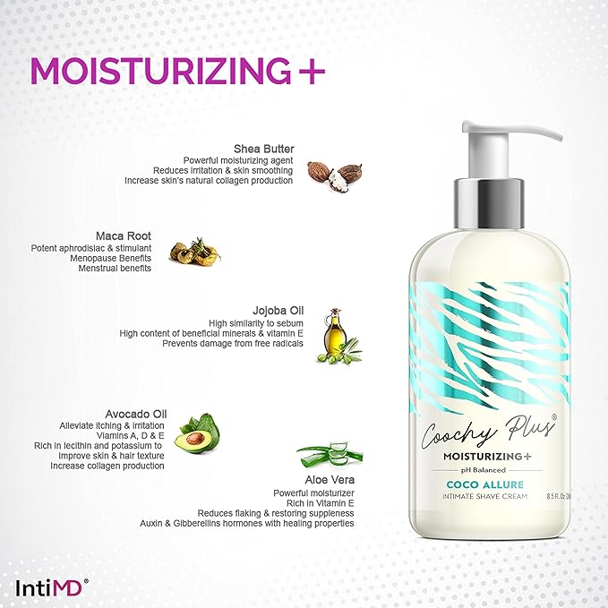 - COOCHY PLUS Intimate Shave Cream is formulated with 5 powerful moisturizing, and vitamins-rich agents that dramatically improves your intimate shaving experience; Jojoba Oil / Avocado Oil / Aloe Vera / Shea Butter / Maca Root. It’s formulated for the most intimate areas of the body, for safely used on any other parts of the body. Helps soften the most coarse body hair, such as pubic hair or underarm hair. MOISTURIZING+ agents form an invisible shield on your skin to deliver a closer shave.