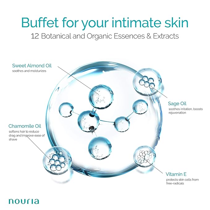 - NOURIA Pre-Shave Elixir Oil contains HydroLock, meticulously formulated with concerted mix of 12 botanical and organic essence and extracts that are rich in deep-hydrating and long-lasting moisturization properties. It further fortifies your intimate skin for maximum moisture retention and prevents moisture loss. Nourishing areas normally forgotten or unnoticed. It reduces ingrown hair, razor burn, razor bump, itchiness and other irritations commonly associated with shaving.