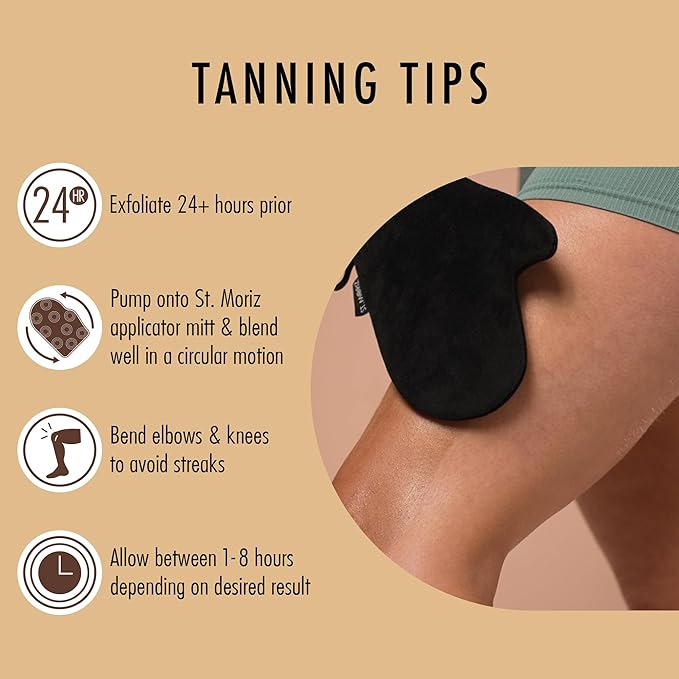 - HOW TO USE: Exfoliate & shave 24+ hours prior. Pump onto an applicator mitt & blend well in a circular motion. When applying, bend knees & elbows to avoid streaks. Your glowing tan will begin to develop after 1 hour & continue to develop for up to 8 hours. After this time, simply wash away the guide colour!