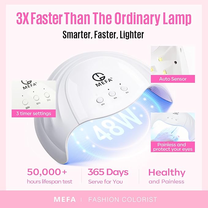 - Advanced Nail Lamp: The 48W lamp dries nails efficiently with three timing settings (30s/60s/90s), save time by drying twice as fast; its automatic smart control turns on when your hand is in and off when removed, enjoy hassle-free nail art manicures