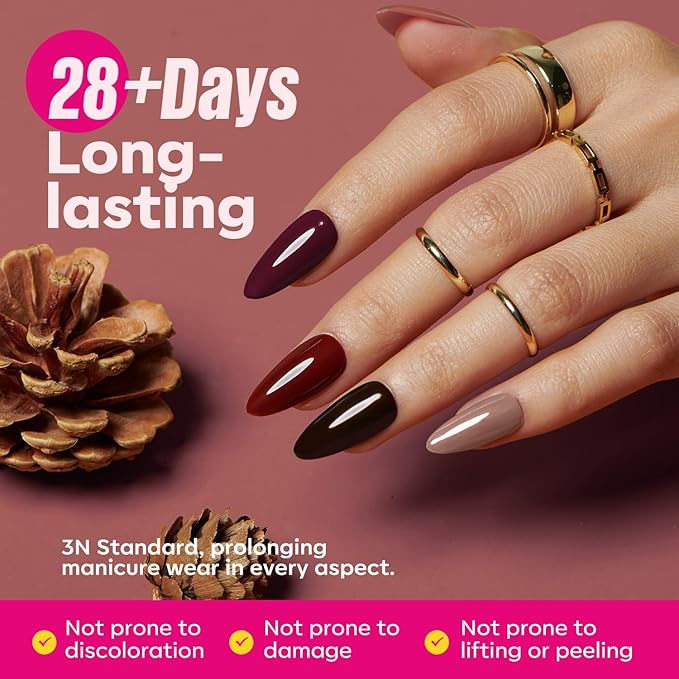 • Classical Gel Nail Polish Kit: 32 iconic and cutting-edge shades: maroon red, dark red, maple leaves orange, pumpkin yellow, glitter gold, walnut brown; this fall tones set not only complements your style but also reflects your individuality