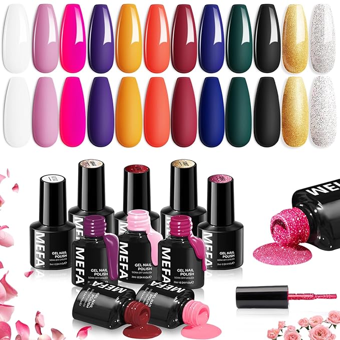 MEFA Gel Nail Polish Set, 12 Colors Gel Nail Kit Pink Red Black Glitter White Blue Yellow Purple Collection with Classic Color for Starters Nail Art Manicure at Home DIY Salon Gifts