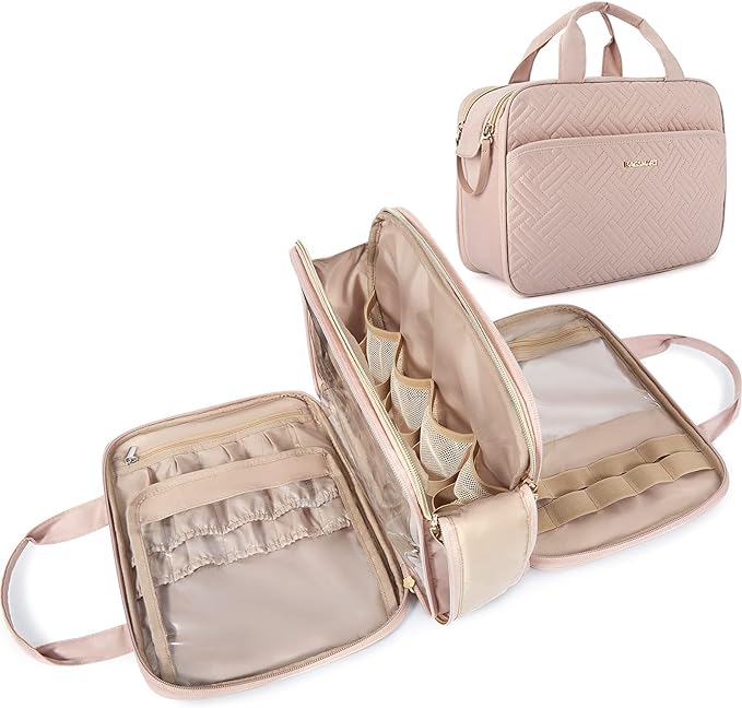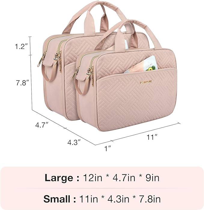 BAGSMART Travel Makeup Bag - Water-resistant Cosmetic Organizer for Full Sized Toiletries, Shampoo, and Accessories (Pink, Large)