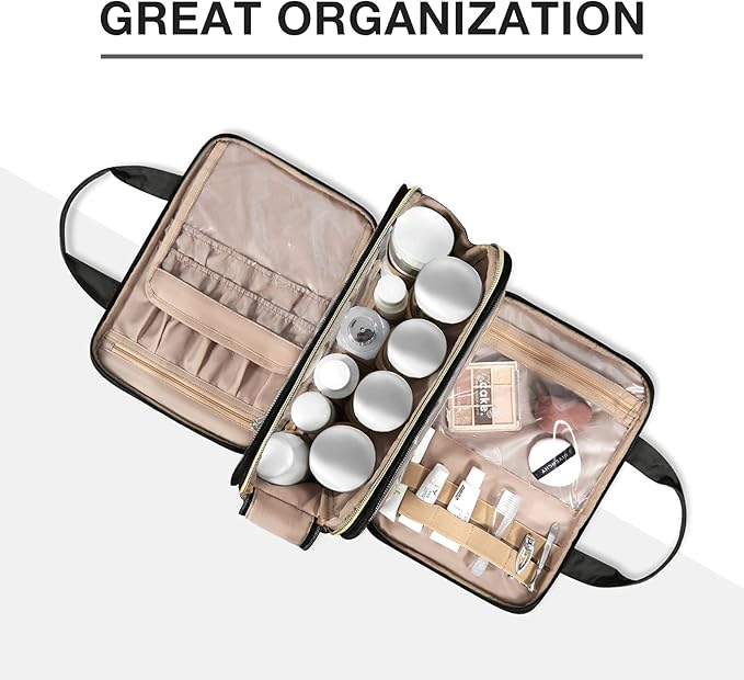 - Double Side Full Open Design: Double side full open design keeps cosmetic bottles can stand upright in the middle compartment. Both sides pockets are design for makeup brushes, eyeshadow palette and other cosmetics