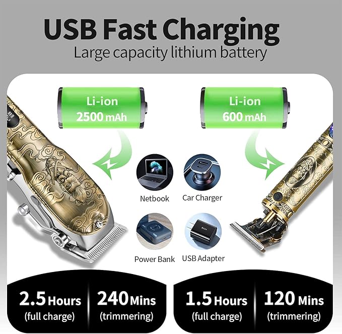 - Intelligent & Time-saving Hair cutting Kit: The LED display can clearly shows the remaining battery percentage, speed, fuel quantity and charging reminder. It is fitted with a large 2500mAh Li-ion battery that can be used for up to 240 minutes after 2.5 hours of charging, and alternatively the small trimmer featuring a 600mAh battery can be charged for 1.5 hours with 120 minutes of use. You can get your desired look quickly and easily with less time and effort spent on haircuts.