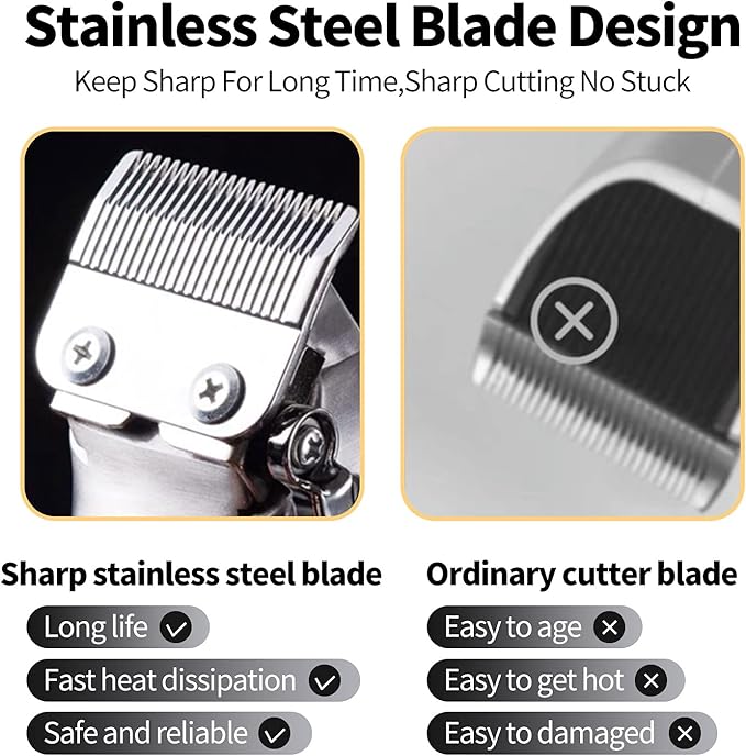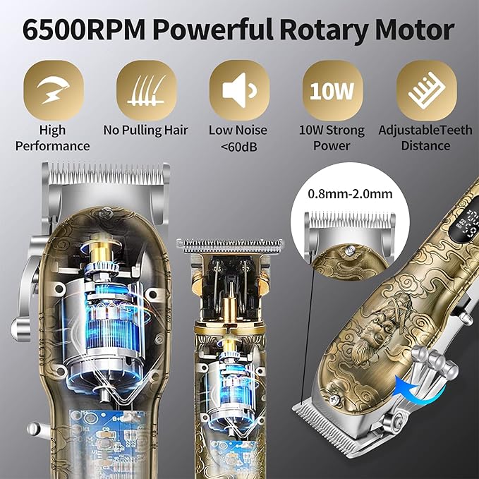 - High Performance T-blade Haircut: This electric pro Li trimmer has a 10W powerful motor with a non-slip surface for easy grip, and a sharp and durable precision stainless steel T-blade for smooth and close cutting. Creating the perfect look for any occasion is easy with its adjustable settings, allowing you to achieve any hairstyle from oil head, engraving push white and vintage haircuts to a classic bald head.