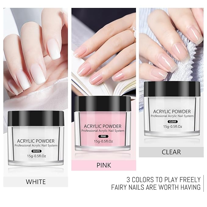 - 【Best Nail Kit - Gospel for Beginners!】: You will get three colors of nail acrylic powder (Pink, White, Clear) to extend nails. Made from professional nail formula and high-quality ingredients and it can last a long time. You can use nail acrylic powder to create nail extensions and carve 3D flowers, or mixed with glitters or sequins and add rhinestone for outstanding results. Enjoy your nail art journey!