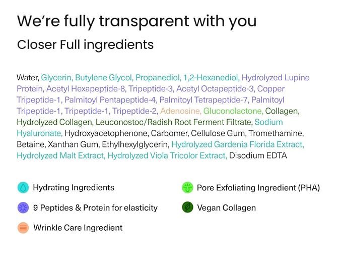 - INSTANT RADIANCE AND BOUNCY SKIN: The synergy of nine peptides, adenosine, and vegan collagen creates a bouncy, glowing complexion, revitalizing your skin's healthy radiance.