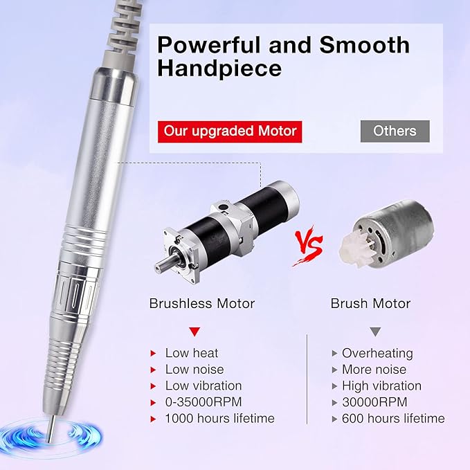 - 【Powerful 80W Brushless Motor】The handpiece is equipped with brushless motor, which is totally driven by magnetic force. Wear-free motor for long-term use, more than 1000h service time. It is quiet and smooth for comfort grip. Low noise for smooth and long-time operation. The professional nail drill with a unique safety protection system to avoid the motor excessive temperature rise.