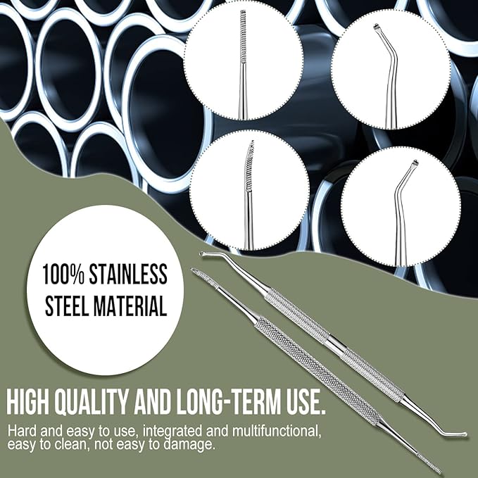 - Ergonomic Design- Easy To Use: The Ingrown toenail file is separately designed with one straight end and one curved end to meet different demands. The cured radian design, joint the nail and can enter into the nail to file away and shine ingrown edges or thick part which dig into the nail, and ingrown toenail lifter is designed with cured little spoons to grab debris or dirty inside nails. Provide a great care for your nails to keep nail healthy, relief the outgrow of toenails by yourself