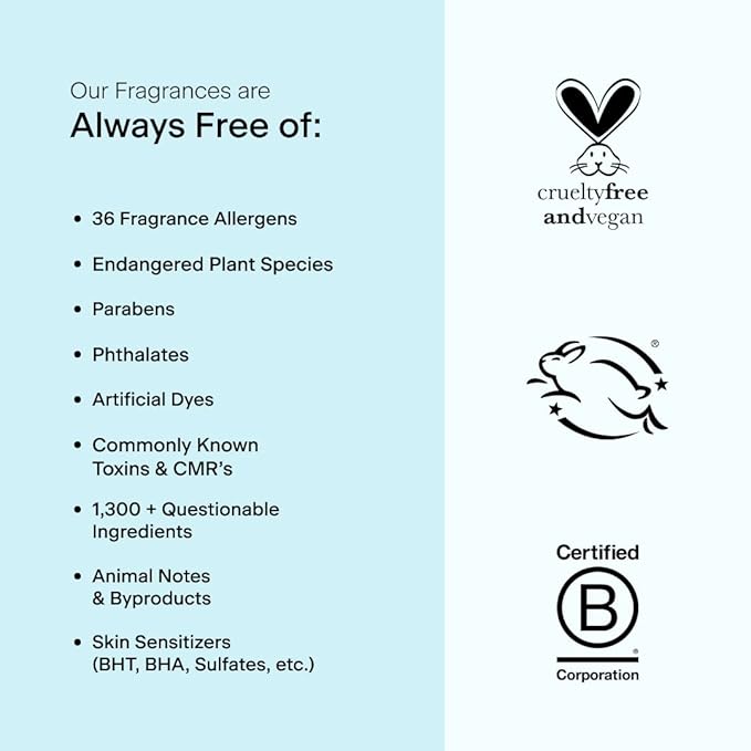 - Responsible Fine Fragrance: We exceed the strictest global regulatory standards to ensure your skin's safety. Our ingredient policy, developed with a toxicologist, intentionally excludes harmful substances, reflecting our commitment to both quality and well-being.