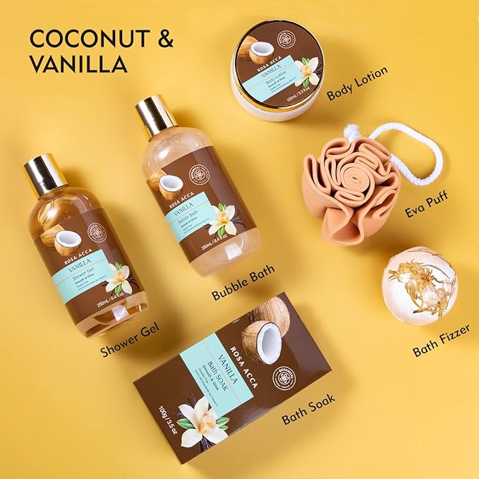 Mothers Day Gifts Spa Gift Basket for Women and Men, 7pcs Vanilla Coconut Bath and Body Self Care Set With Bath Bomb, Shower Gel, Parfume Lotion, Spa Kit, Skin Care, Birthday, Bridal Shower, Christmas