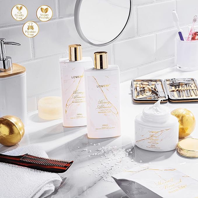 • HONEY ALMOND BEAUTY & PERSONAL CARE SET: This premium beauty & personal care package is infused with Almond Oil and Honey for an invigorating aromatherapy experience that is also one of the best things you can do for your skin! They are made with Natural Ingredients and is rich in Vitamin E and Shea Butter to protect and keep skin moisturized. Our Home Spa Basket is Paraben and Cruelty Free