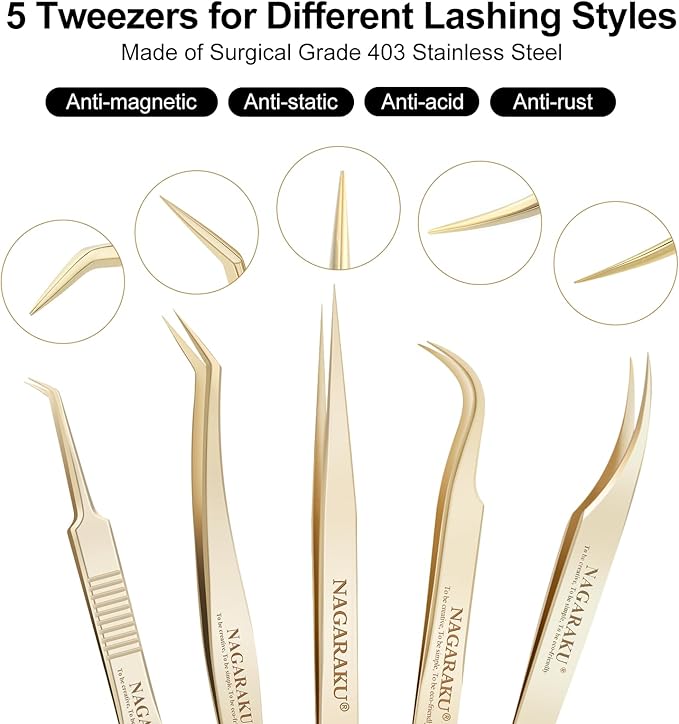 NAGARAKU 5 PCS Tweezers for Eyelash Extensions Straight and Curved Precision Professional Tweezer for Lash Extensions Volume Easy Fanning lash Precise Point with Storage Case Bag