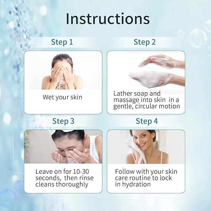 - How to use 1、Wet skin and lather soap; 2、Massage into skin in a gentle, circular motion; 3、Leave on for 10-30 seconds; 4、Rinse cleans thoroughly; 5、Follow with your skin care routine to lock in hydration.