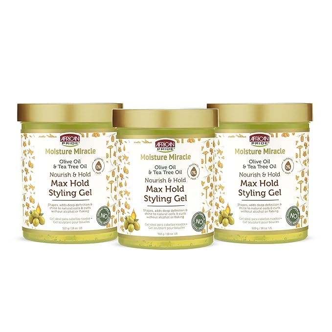 African Pride Moisture Miracle Olive & Tea Tree Oil Max Hold Styling Hair Gel (3 Pack), For Natural Coils & Curls, 18 oz
