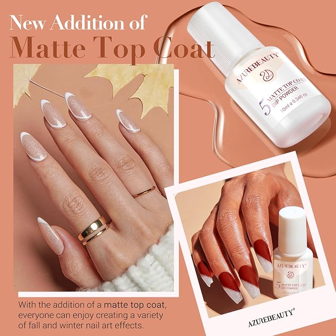 - Superior Quality & Healthy Formula: Fortified with calcium and tough against daily wear and tear compared to traditional nail lacquer, gel polish, and traditional acrylic systems. AZUREBEAUTY dip nail kit is of longevity, anti-chip. Unrivaled shiny and vivid, non-yellowing, and superb adhesion. DO NOT contain any preservatives and harmful substances, safe and low-odor with NO damage to your nail bed