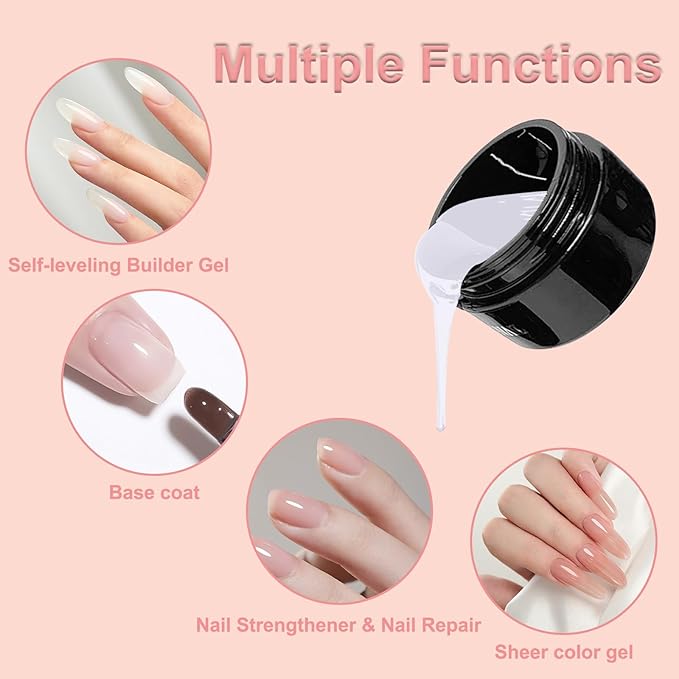 - 【4 In 1 Gel Nail Polish and Easy Application】Can be used as Self-leveling Builder Gel & Base Coat (Do not be top coat) & Sheer Color Gel & Nail Strengthener, Nail Repair. The gel is smooth, everyone could finish their manicure in a short time at home. Suitable for beginners and the nail art lovers.