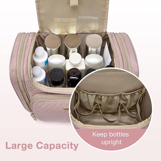 BAGSMART Travel Toiletry Bag for Women, Hanging Toiletry Bag Large Capacity Cosmetic Makeup Bag, Essentials Travel Organizer for Full Sized Toiletries and Cosmetics, Pink