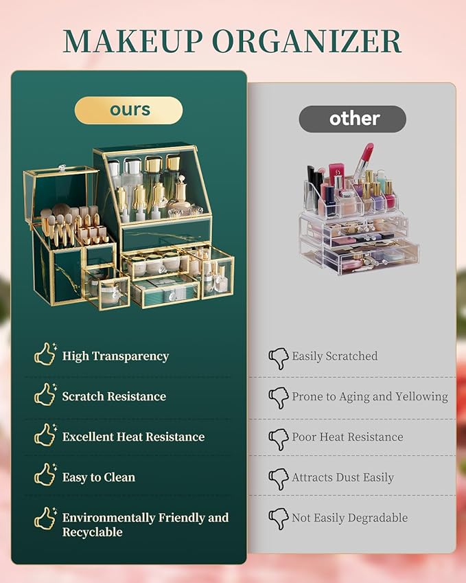 - Elegant Green Glass Design with Calm Luxury:Crafted from premium glass with a soft green tint, this green makeup organizer adds natural elegance to any vanity or bathroom counter.