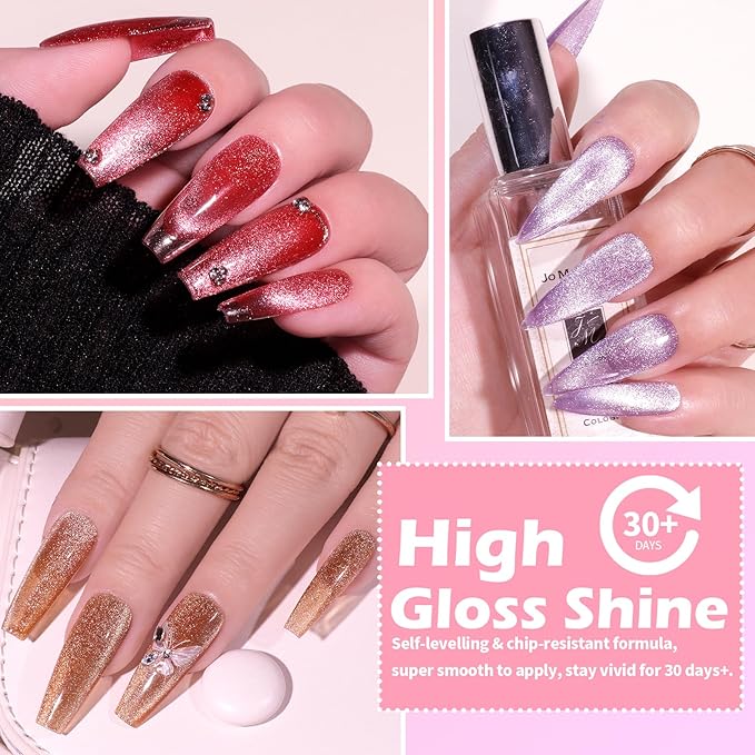 - 🌸【High Glossy Shine & Long-Lasting】The upgraded cat eye gel nail polish can last over 30+ days with correct application. Good toughness and tinting strength bring you a brilliant shiny finish and smooth appearance. The gorgeous cat eye gel nail art set is perfect for all daily working or dating, vacations party, or ceremony activities.