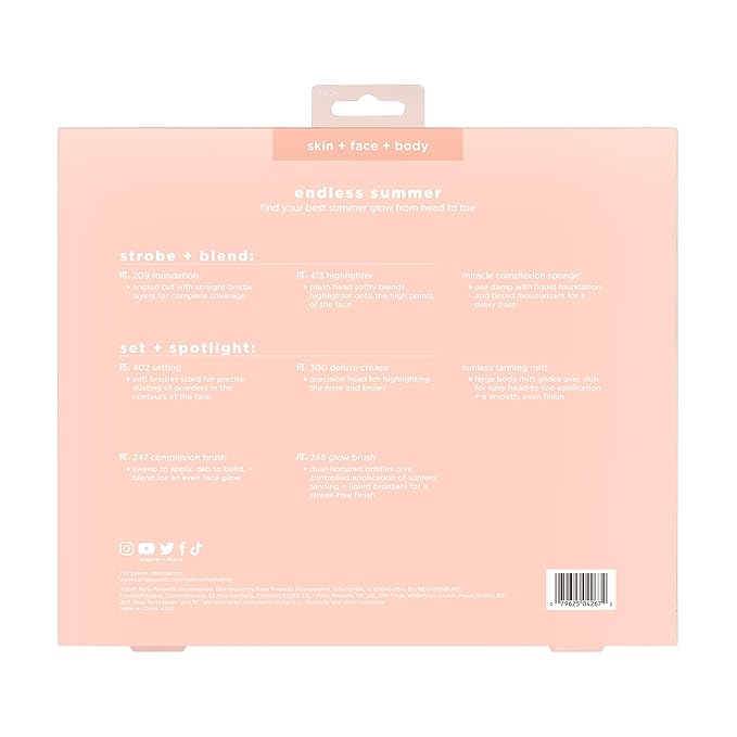 - The Real Techniques Endless Summer Makeup Brush Kit includes (1) Strobe plus Blend dual-ended brush: RT 209 foundation brush plus RT 413 highlighter brush, (1) Set plus Spotlight dual-ended brush: RT 402 setting brush plus RT 300 deluxe crease brush, (1) miracle complexion sponge, (1) sunless tanning mitt, (1) RT 247 complexion brush, and (1) RT 248 glow brush